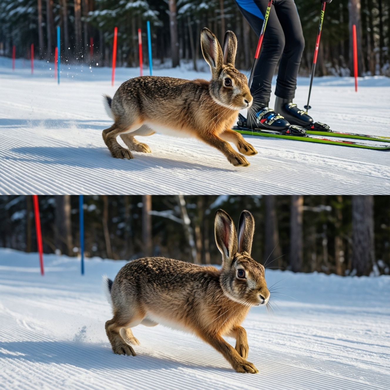 Судя по кадрам, лесной гость чувствовал себя уверенно. Он пересекал подготовленную лыжню легко и быстро, будто демонстрируя собственную манеру передвижения и скорость, не уступающую темпу спортсменов. Заяц ловко держался на плотном снежном полотне и без суеты уходил в сторону леса, не вступая в контакт с людьми.